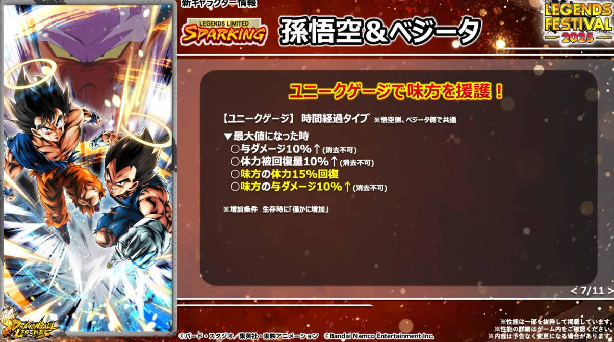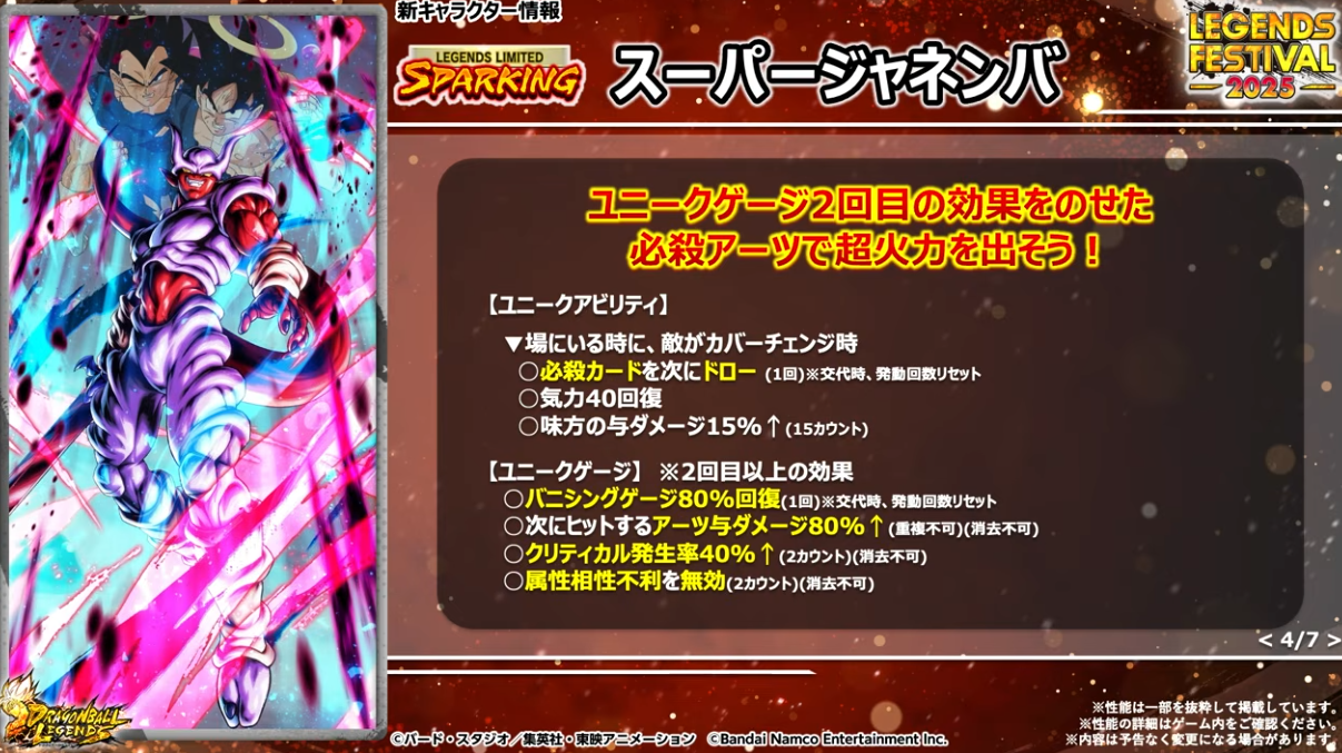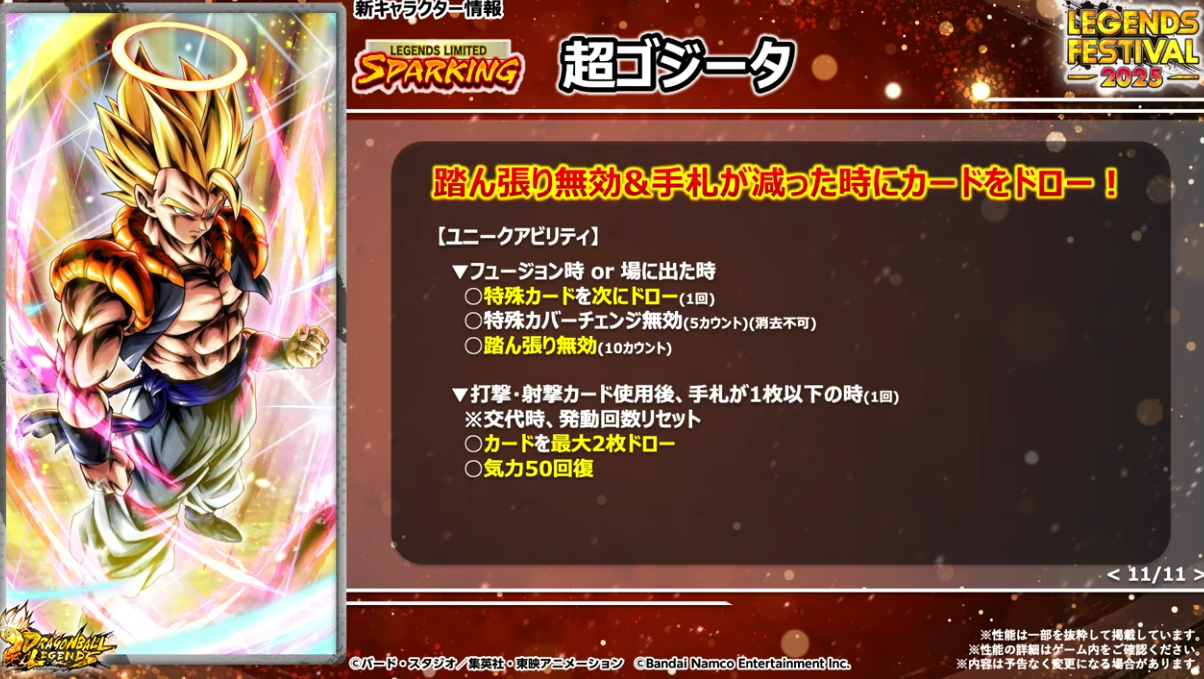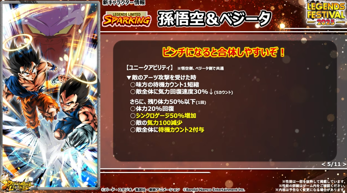 HP50%以下でユニークアビリティが発動するのでゴジータへフュージョンしやすくなる。さらに体力回復、敵の気力100ダウン、待機カウント付与などの効果もある。