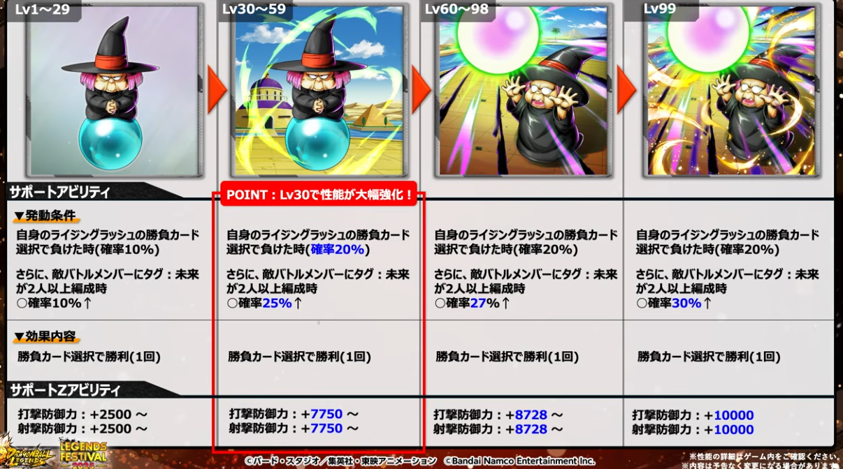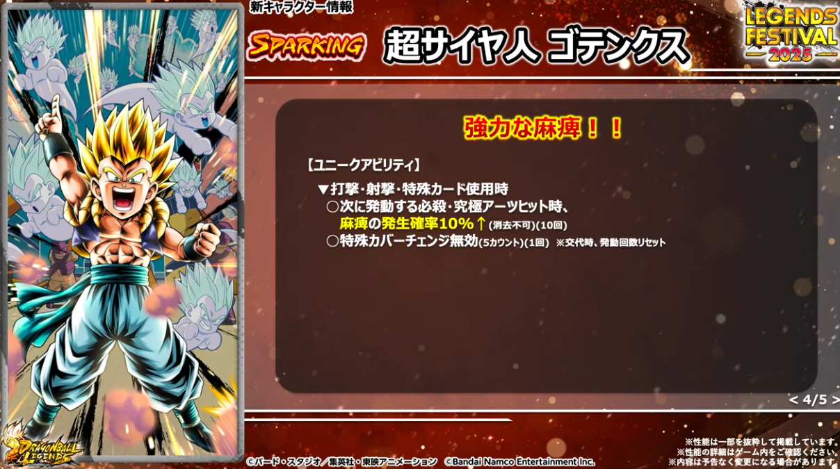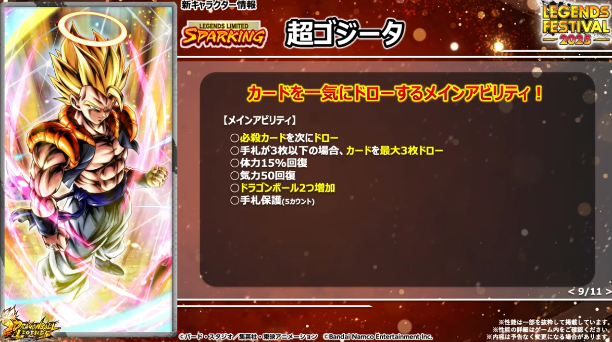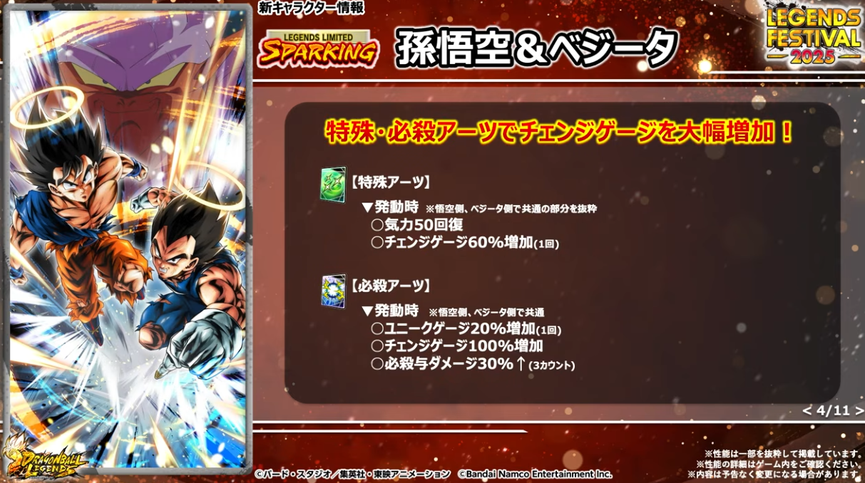 HP50%以下でユニークアビリティが発動するのでゴジータへフュージョンしやすくなる。さらに体力回復、敵の気力100ダウン、待機カウント付与などの効果もある。
