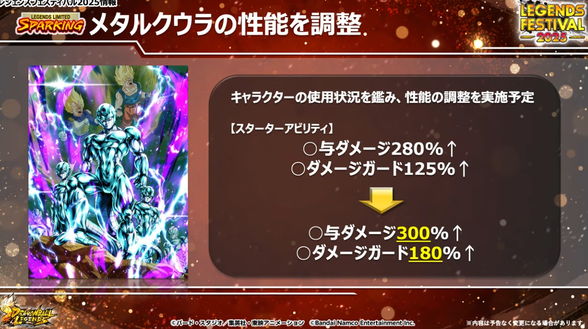 使用率が低かったのかLLメタルクウラの性能が上方修正。スタートアビリティの与ダメージ、ダメージガードがアップしています。