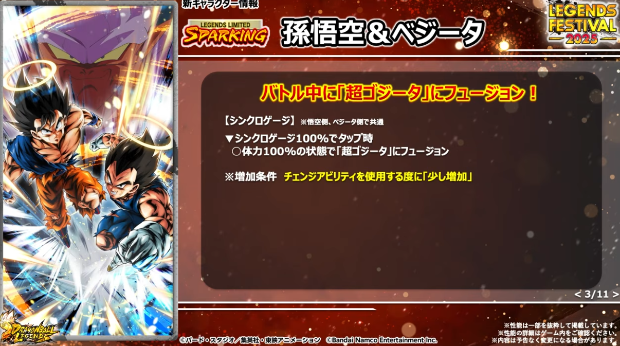 シンクロゲージが100%になるとゴジータへフュージョン。このシンクロゲージはタッグチェンジとHP50%以下で増加するそうです。