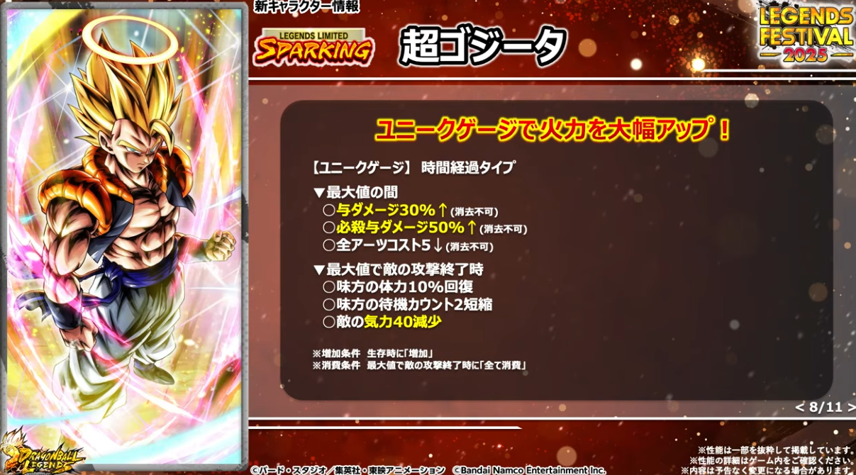 超ゴジータへフュージョンすると大きく火力がアップ。ユニークゲージは時間経過タイプで与ダメージと必殺与ダメージをアップしコストもダウン。