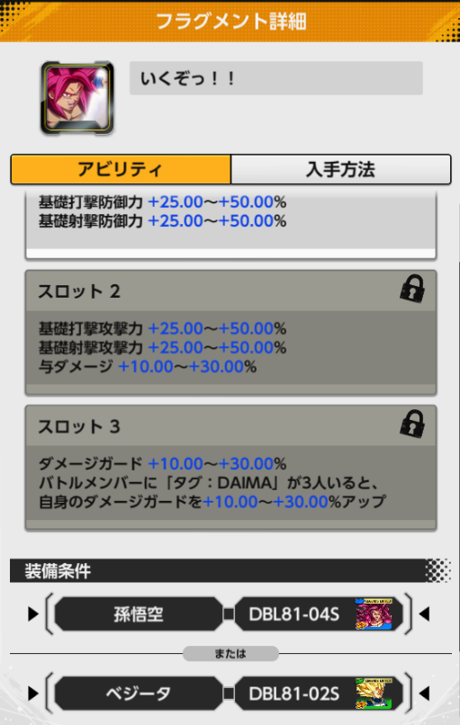 いくぞっ!!! (1) 基礎体力15%(1) 基礎打撃防御力50%(1) 基礎射撃防御力50% (2) 基礎打撃攻撃力50%(2) 基礎射撃攻撃力50%(2) 与ダメージ30% (3) ダメージガード30%(3) バトルメンバーに「タグ:DAIMA」が3人いると、 自身のダメージガード30% |