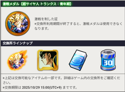 1日1回限定で大量の「激戦メダル【超サイヤ人トランクス:青年期】」を入手可能。毎日忘れずにプレイしましょう!