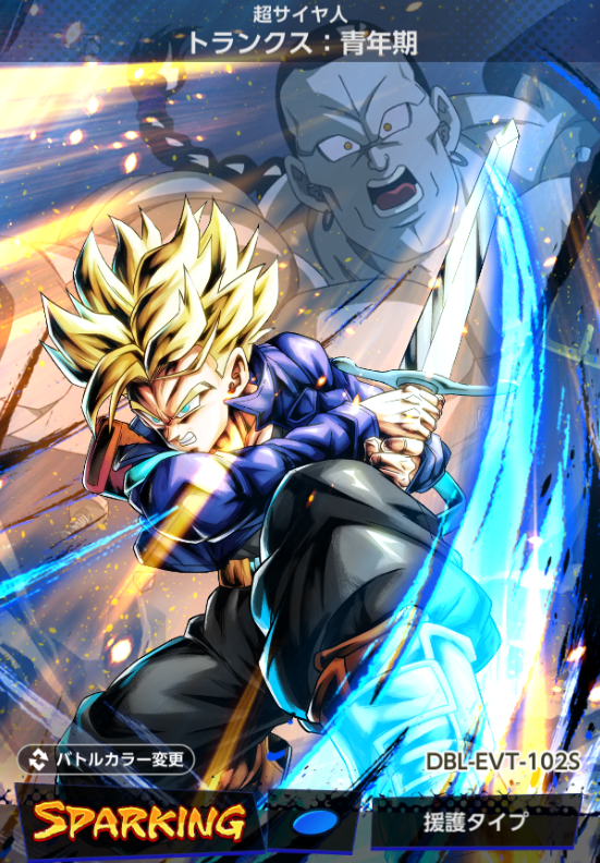 イベント限定SPARKINGキャラクター「超サイヤ人 トランクス:青年期 (DBL-EVT-102S)」新登場!イベントを攻略して限界突破を目指しましょう。