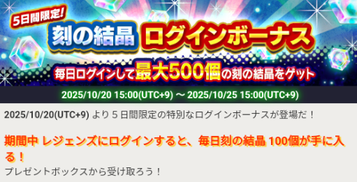 ドラゴンボールレジェンズでは2025年10月20日(月曜日)より5日間限定の特別なログインボーナスが登場!期間中レジェンズにログインすると、毎日刻の結晶100個獲得できます。ログインボーナスはプレゼントボックスから受け取りましょう。