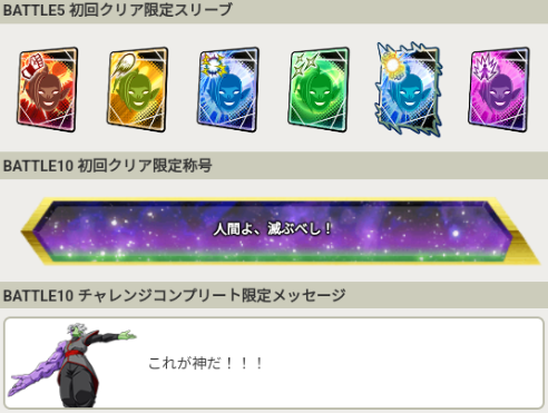 10ステージまでクリアすると、刻の結晶合計500個や、スロットリムーバー合計30個、さらに、スリーブ【無限ザマス】やメッセージ「これが神だ!!!」、限定称号「これが神だ!!!」も入手できます。
