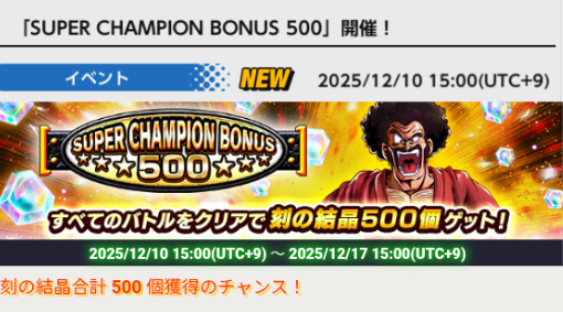 刻の結晶が合計500個獲得できる期間限定イベント「SUPER CHAMPIONS BONUS」開催。1日に挑戦できるステージは2つまで!全5ステージクリアすると刻の結晶を500個入手できます。