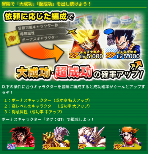 「イベントアイテム」をたくさん集めるには、冒険で「大成功」「超成功」を出し続け、効率よく集めたい。以下の条件に合うキャラクターを冒険に編成すると成功確率がアップします。