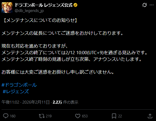 23時ごろレジェンズ公式Xにてメンテナンスの続報ポストが公開。それによると現在も対応中ですがメンテナンスの終了については2月12日10時以降になるそうです。10分前にポストされたばかりなのに160件も反応があるのは、皆楽しみにしてた証拠。