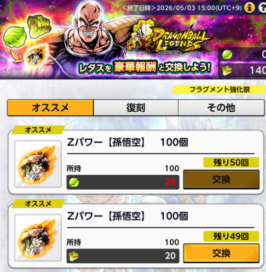 イベント「野望の豊作」の報酬で入手した「みずみずしいレタス」や「シャキシャキレタス」はイベント限定「SP農作業孫悟空」と交換できます。