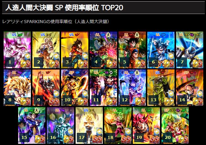 [2025/10/16] 公式情報「人造人間大決闘」のバトルランク 70 以上における、PvP使用率TOP20で更新。まだまだトップ独走!終形態フリーザ:フルパワー1位!2位UL超サイヤ人孫悟空、3位UL超サイヤ人4ベジ